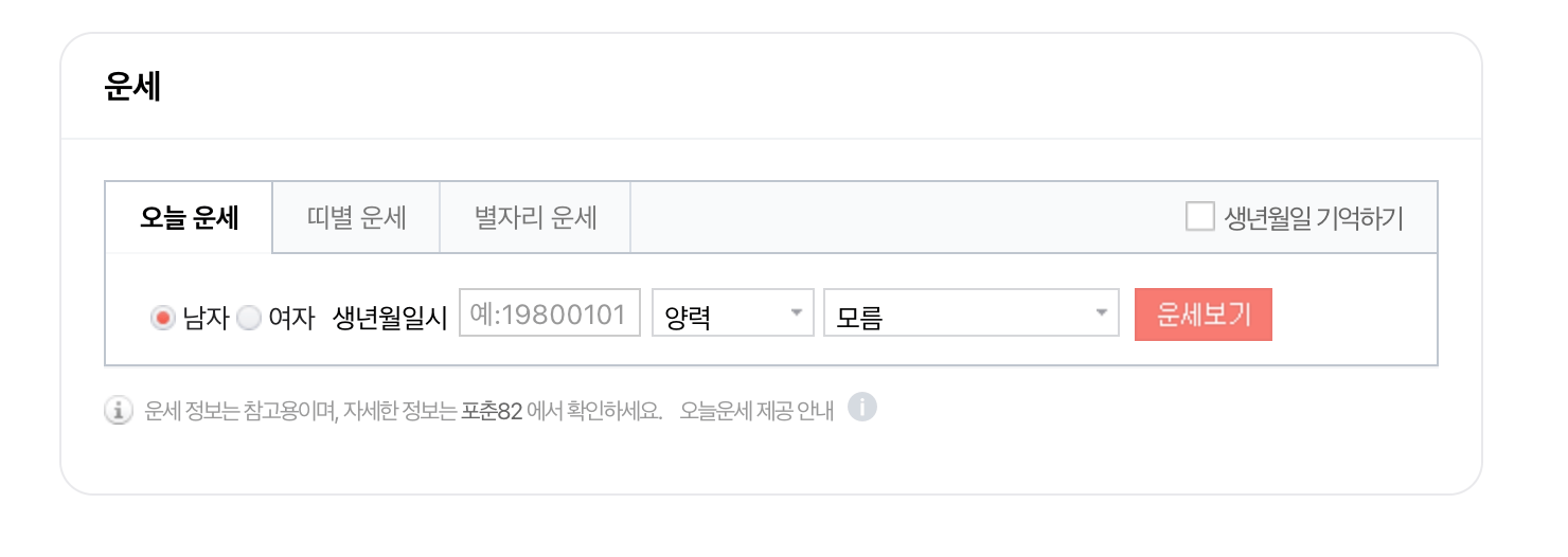 네이버는 다양한 운세 서비스를 제공합니다. 오늘의 운세, 별자리, 띠별운 등을 검색하여 언제든지 본인의 운세를 확인할 수 있지만, 신년운세는 연말에 공개됩니다. 자세한 내용을 제공하는 전체운세와 월간 운세, 간략한 요약이 제공되는 일생 운세를 보실 수 있습니다. 네이버 무료 사주를 보고 싶으시면 아래 바로가기를 이용해 사용하시면 됩니다.