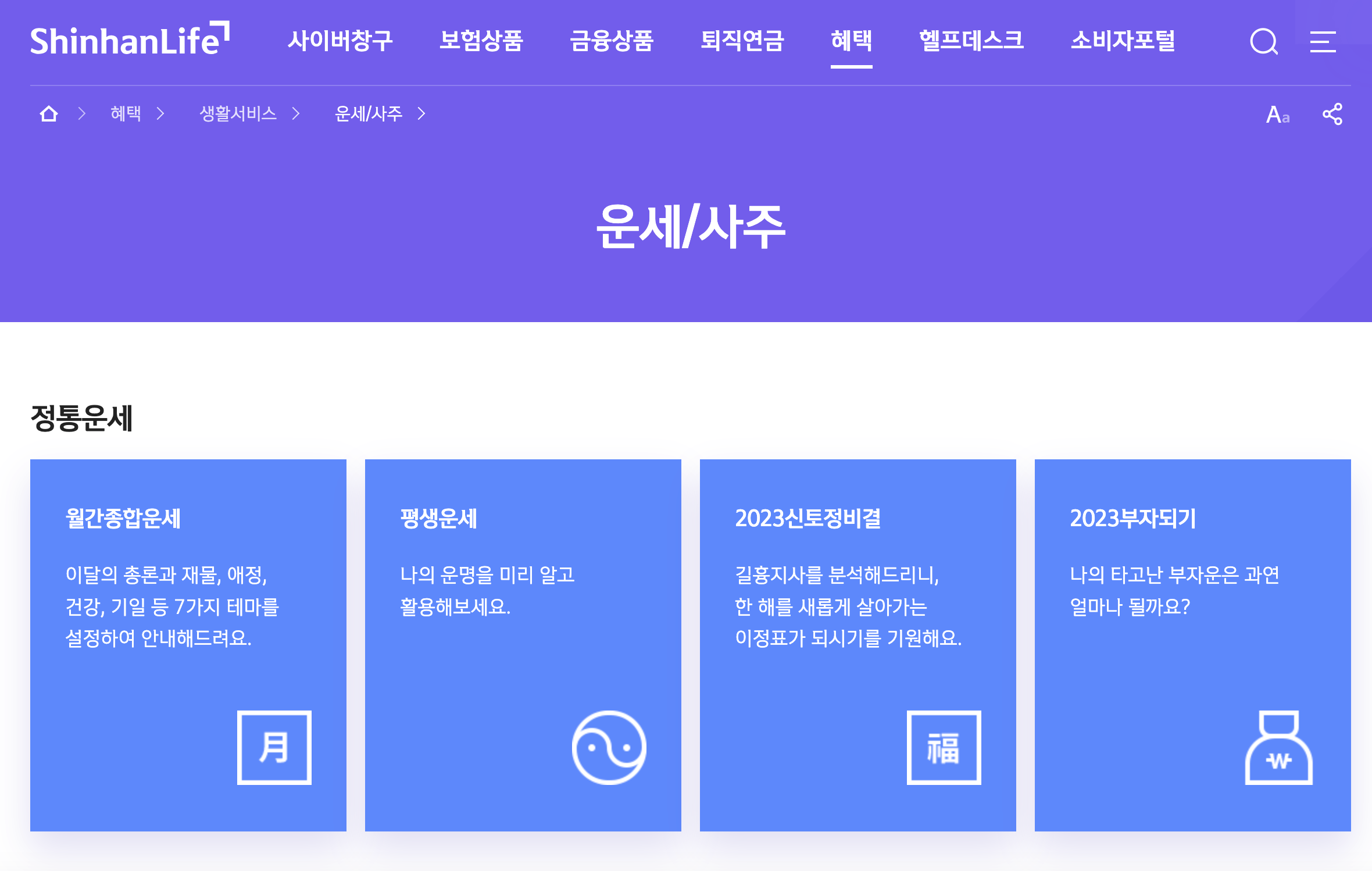 신한라이프 신년운세는 신한생명보험 웹사이트에서 쉽게 확인할 수 있습니다. 월간종합운세, 신토정비결, 평생운세, 부자되기, 애정/궁합, 생활운세, 주간종합운세, 운명의 배우자, 내사랑 반쪽찾기, 오늘의 타로, 프리미엄 로또운세, 궁합보기 등 여러가지 서비스를 제공하고 있습니다. 신한라이프 신년운세를 보실 분들은 아래 바로가기를 클릭해주세요.